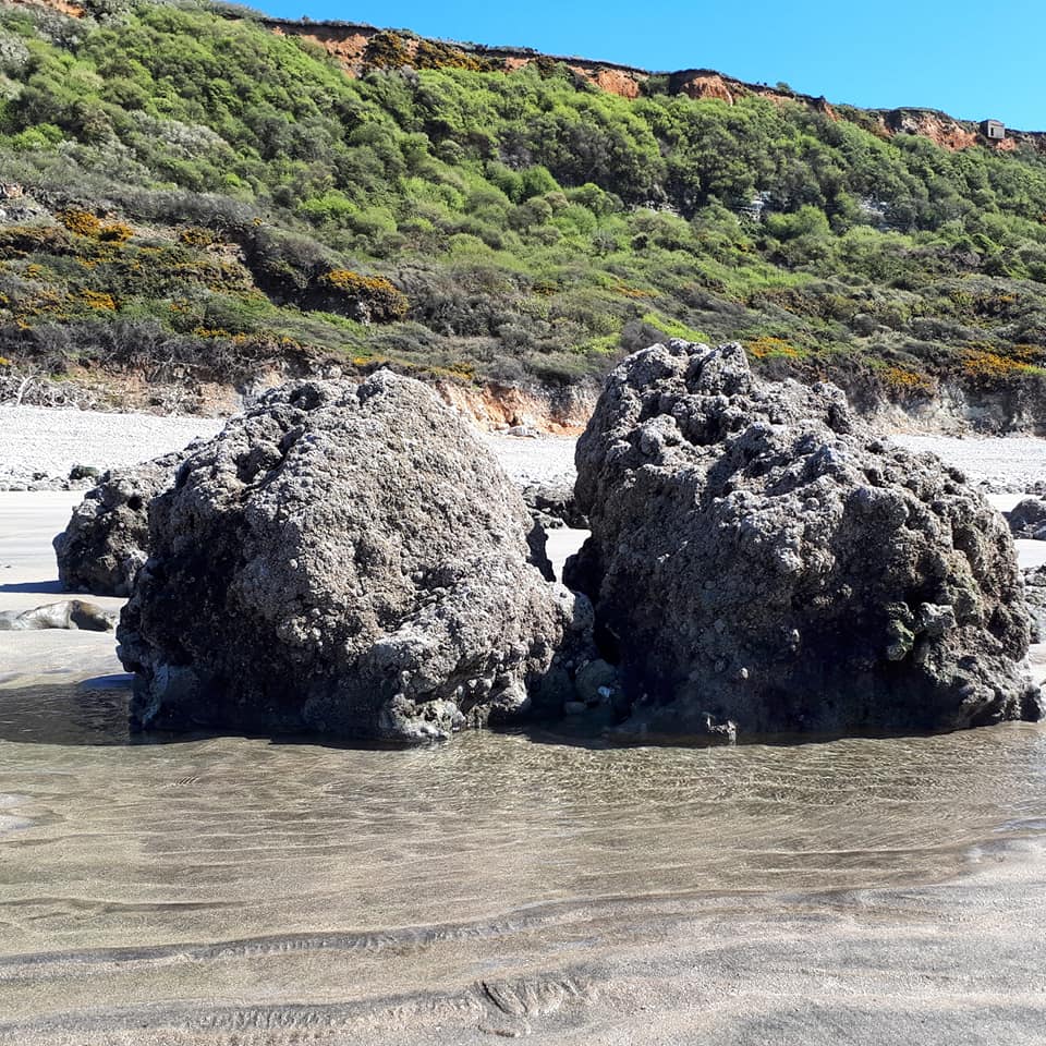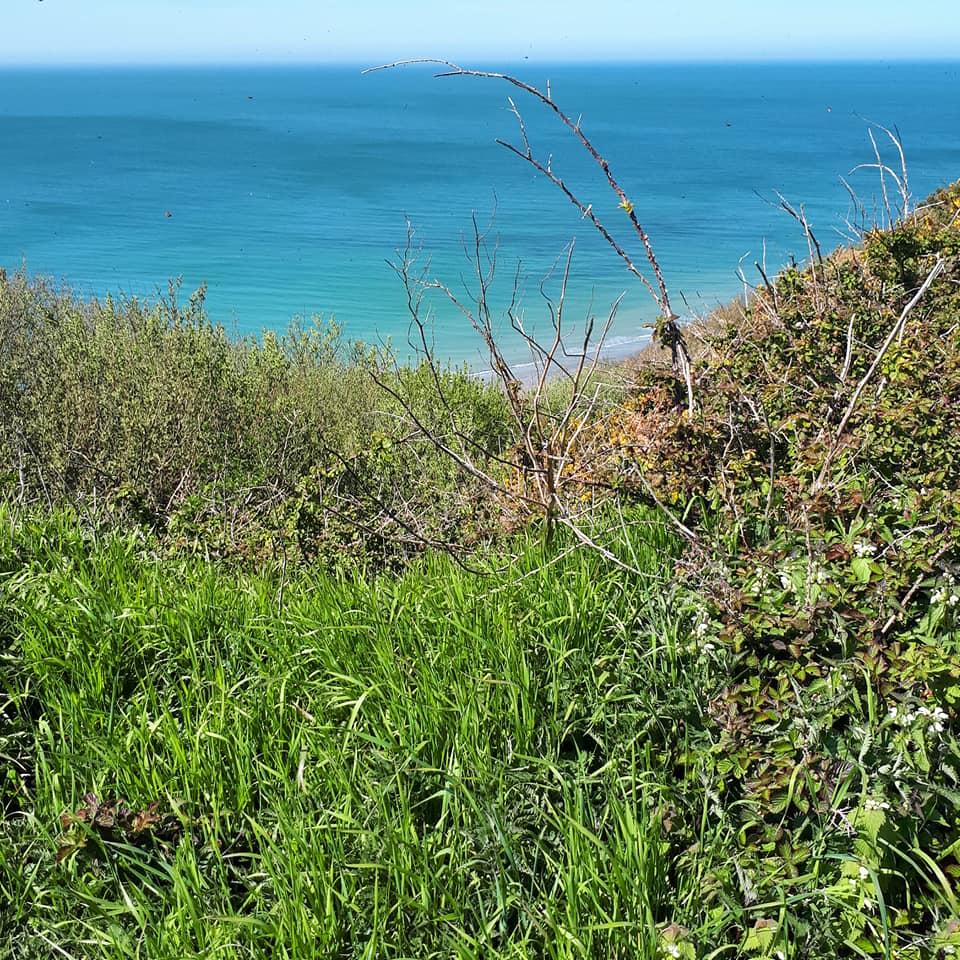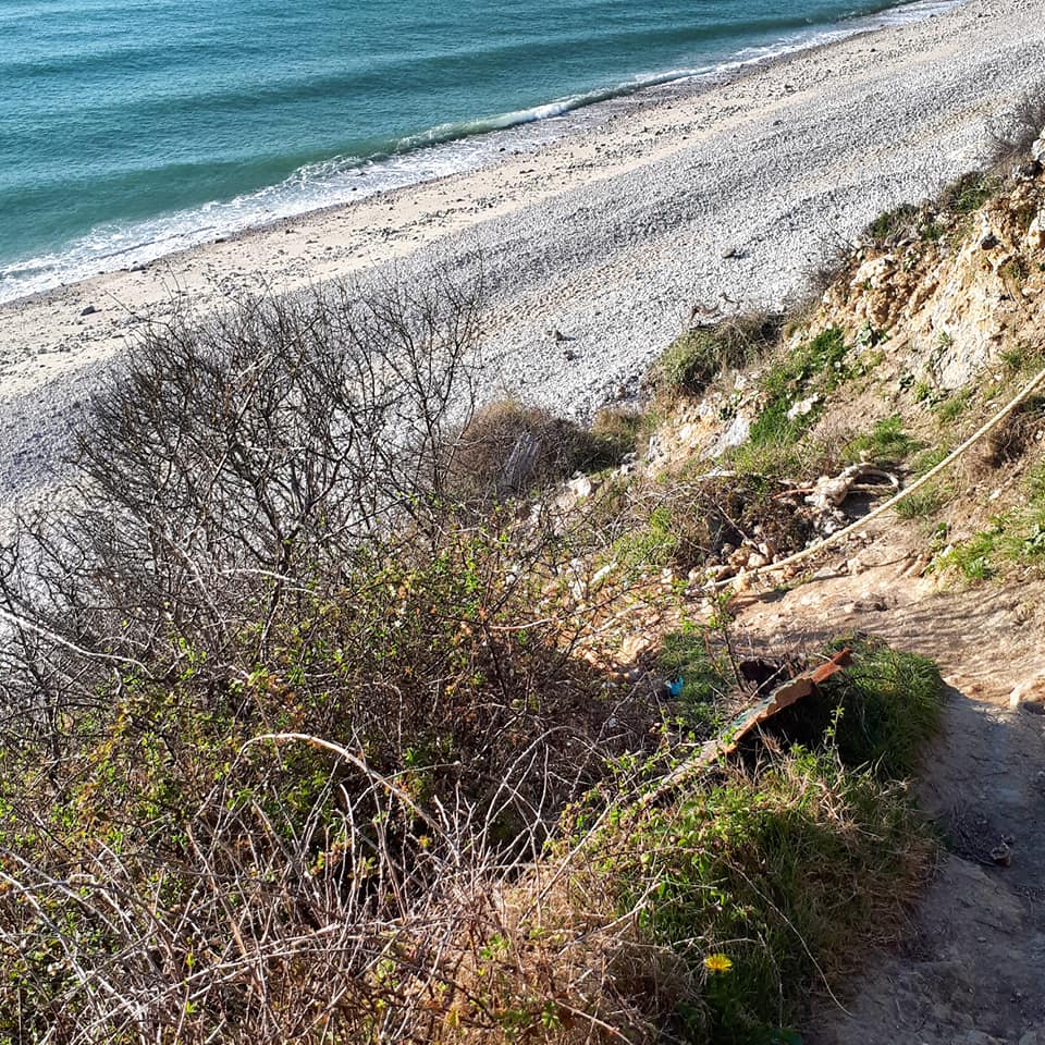 Mais avant, nous avons pris un tout petit chemin qui longeait la falaise. Puis il a fallu descendre petit à petit. Elle m’avait prévenue : « au bout du chemin, il y a une corde pour accéder à la plage. Cette corde, on la vole régulièrement. On la remplace régulièrement. »
