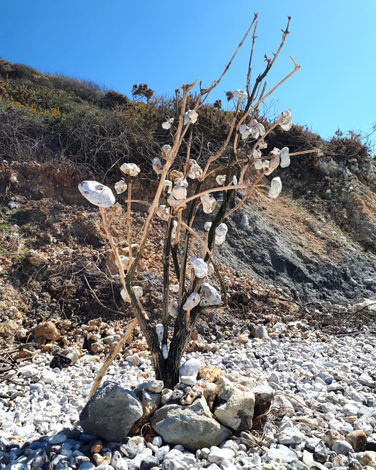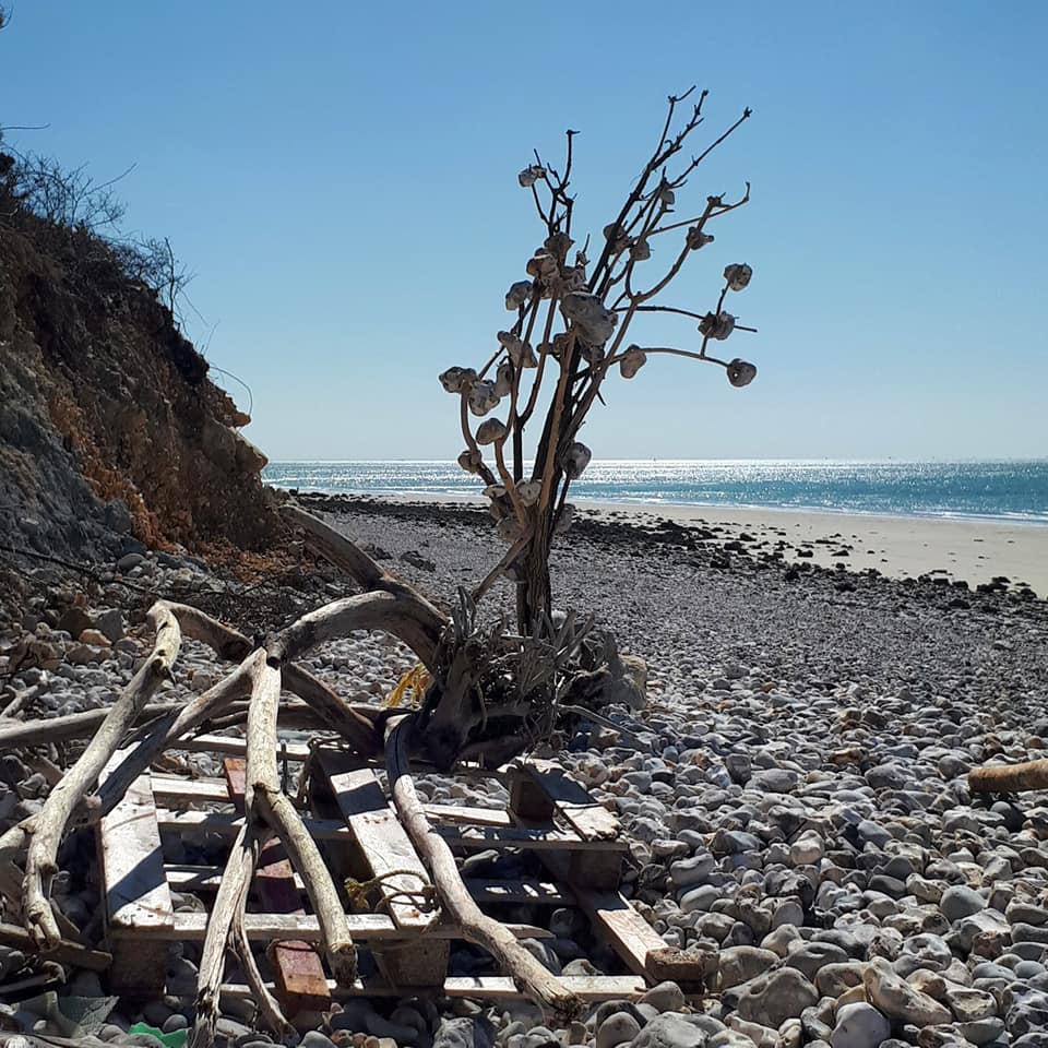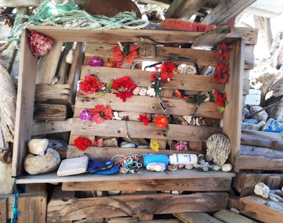 Elle m’a raconté l’histoire de la cabane. C’est Ludo qui la construit peu à peu. Il ramasse tout ce qu’il trouve sur la plage : le bois flotté, des tongs, des fleurs en plastique, des gourdes et bien d’autres choses. Qu’il accumule dans la cabane, sur des étagères.