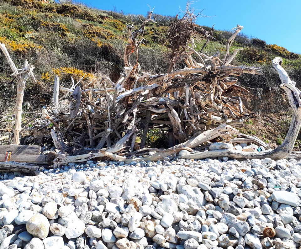 Incroyable, cette cabane. Au pied de la falaise, un amas de bois flottés qui s’enchevêtrent. Blanche, la cabane, lumineuse. Avec une entrée et deux terrasses. Nous avons installé nos affaires sur l’une d’elles, en plein soleil. Et ma copine s’est mise en maillot de bain et est allée se baigner !