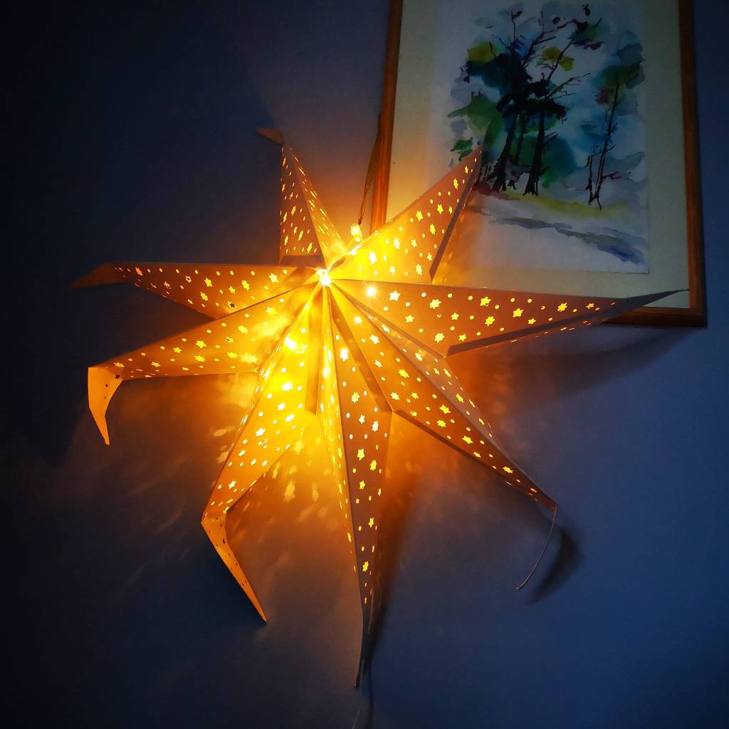 Bon, j’avais un peu mal rangé l’étoile dans la malle à déco. J’ai dû forcer sur le couvercle pour tout tasser et fermer. Aujourd’hui, elle est un peu cabossée.