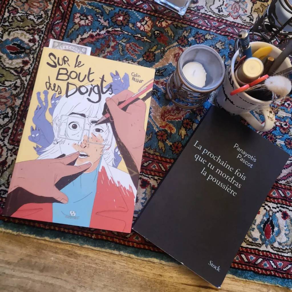 « La prochaine fois que tu mordras la poussière » de Panayotis Pascot et une BD « Au bout des doigts » de Colin Attard. Deux petits jeunes auteurs. Ils ont 24 ou 25 ans. Tous deux ont fait une bio, une autofiction, appelons ça comme on veut, en tout cas, ils ont mis énormément d’eux-mêmes dans leur œuvre, ils se sont livrés, mis à nus avec beaucoup de courage et de maturité. Je suis époustouflée par la profondeur, l’analyse de leur vie, de leur histoire qu’ils ont réussies à mettre en mots, en dessins, eux qui sont si jeunes, qui ont tant à découvrir encore. Une chose est sûre c’est que je n’en étais pas là à leur âge. J’en étais très loin même. Ils me touchent, m’émeuvent d’autant que j’essaie depuis quelques mois d’écrire une bio sur ma famille !!!!